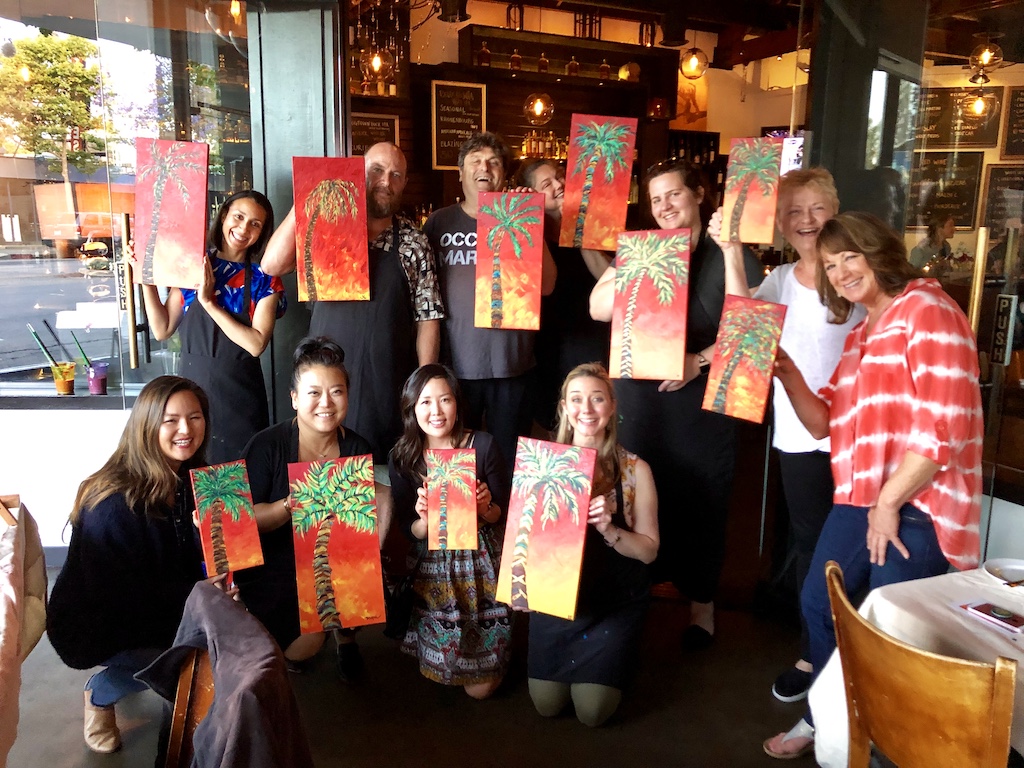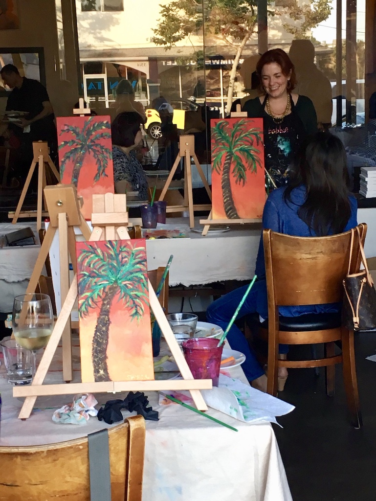 We had the pleasure of having Bobbie Rich, a talented local Santa Monica artist, visit us at Upper West in our private dining space for an exciting Wine and Painting class. Bobbie brought together 20 artists of all levels and walked them through a how-to painting session of a gorgeous Sunset & Palm Tree scene. All of the paintings looked amazing, and everyone had a wonderful time.